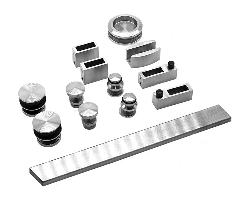 Kit a vidrio para puertas corredizas y paños con elegantes herrajes a la vista de acero inoxidable cromado.